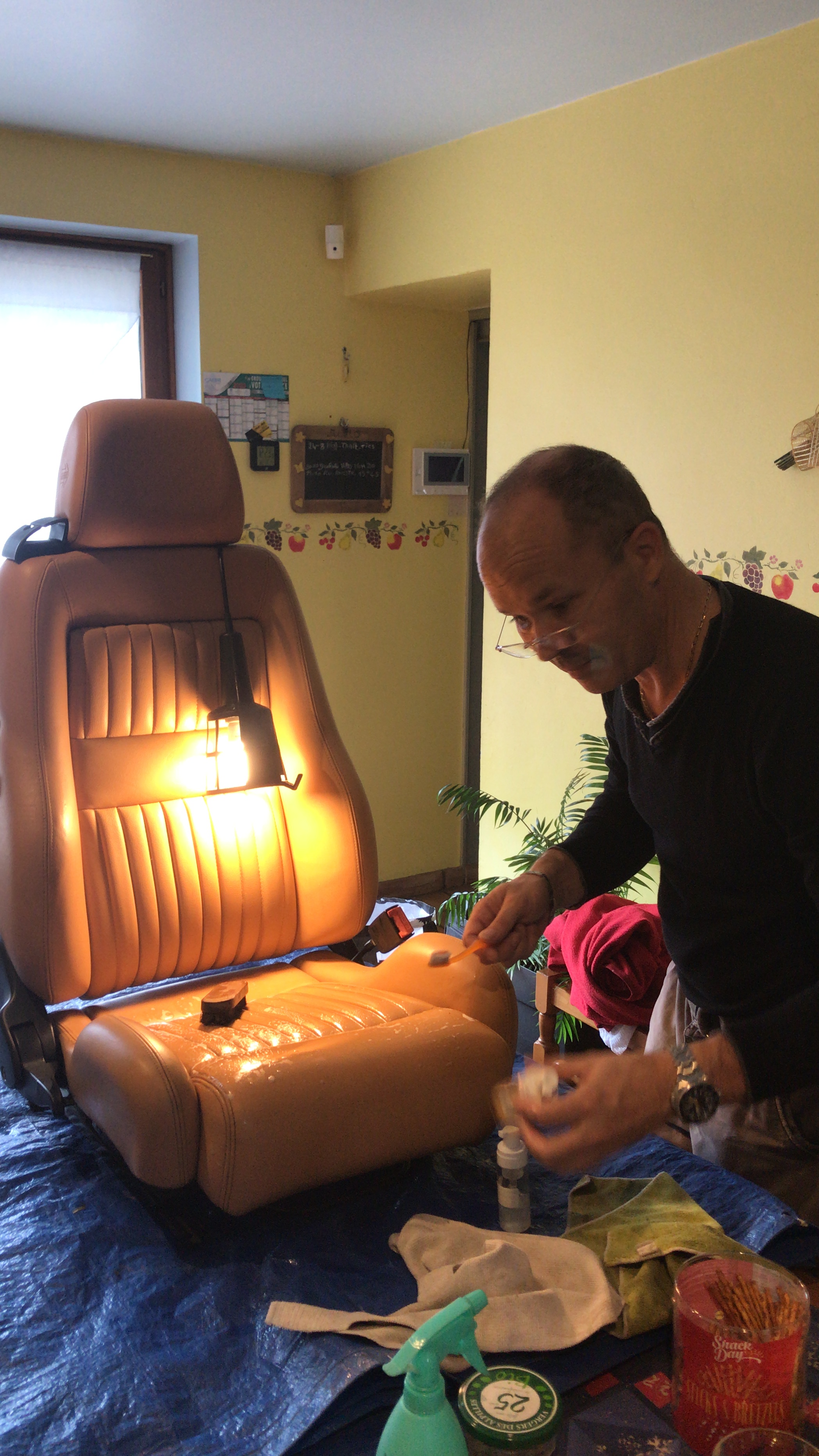 Démontage des sièges pour leurs remplacement par des cuirs Le coussin du conducteur était usé avait un trou Mister Curve est venu me voir pour s'en occuper (merci à lui) Dernière retouche et il c'est attaqué au volant qui en avait besoin Final et voilà le résultat monté Les sièges tissus on été revendu Intervention sur la capote qui était décousus sur la lunette arrière (c'est papa et maman qui sont intervenu) Beaucoup mieux 3 éme Feux de stop remplacé et remplacement du moteur de la capote reste la distribution qui sera faite en novembre
