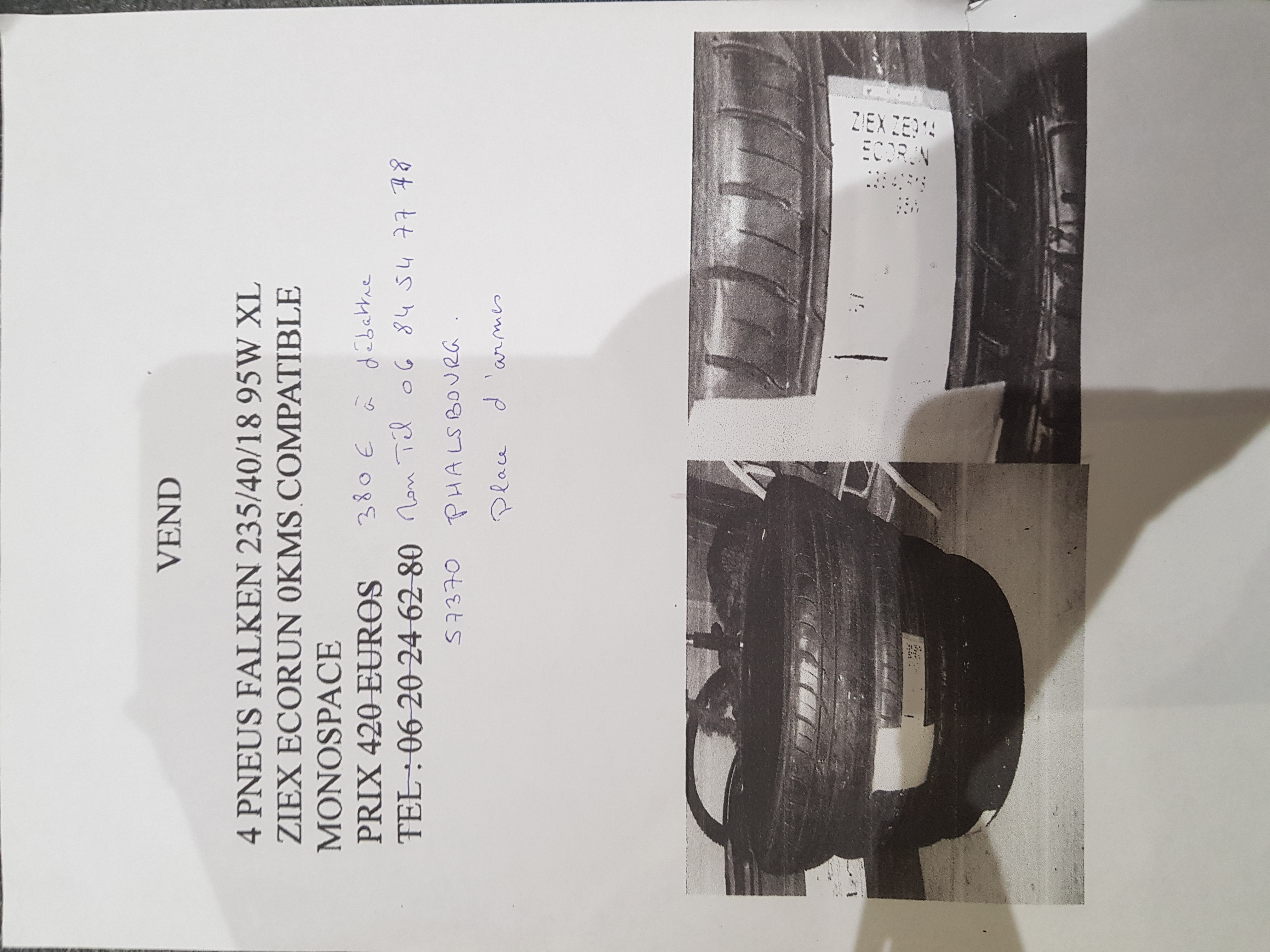 mecano67 a écrit : ↑sam. 18 mars 2017 14:31 20160417_184149-1(2).jpg20160417_184149(2).jpegvoilà je vend 4 pneus de marque FALKEN en 235/40/18 95w xl ziex ecorun neufs stockés au chaud et au sec à l abri du soleil .