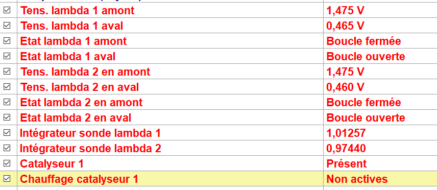 Bref j'ai regardé le voltage des 2 sondes Lambdas (Amont et Avalle) et je me suis rendu compte que les valeurs ne bougeaient presque pas alors que ça devrait osciller et surtout le voltage de la sonde en amont est constamment à 1,49V. Après divers recherches, il s'avère qu'une valeur correcte d'une sonde lambda est entre 0.1 et 0.4 en fonctionnement ...