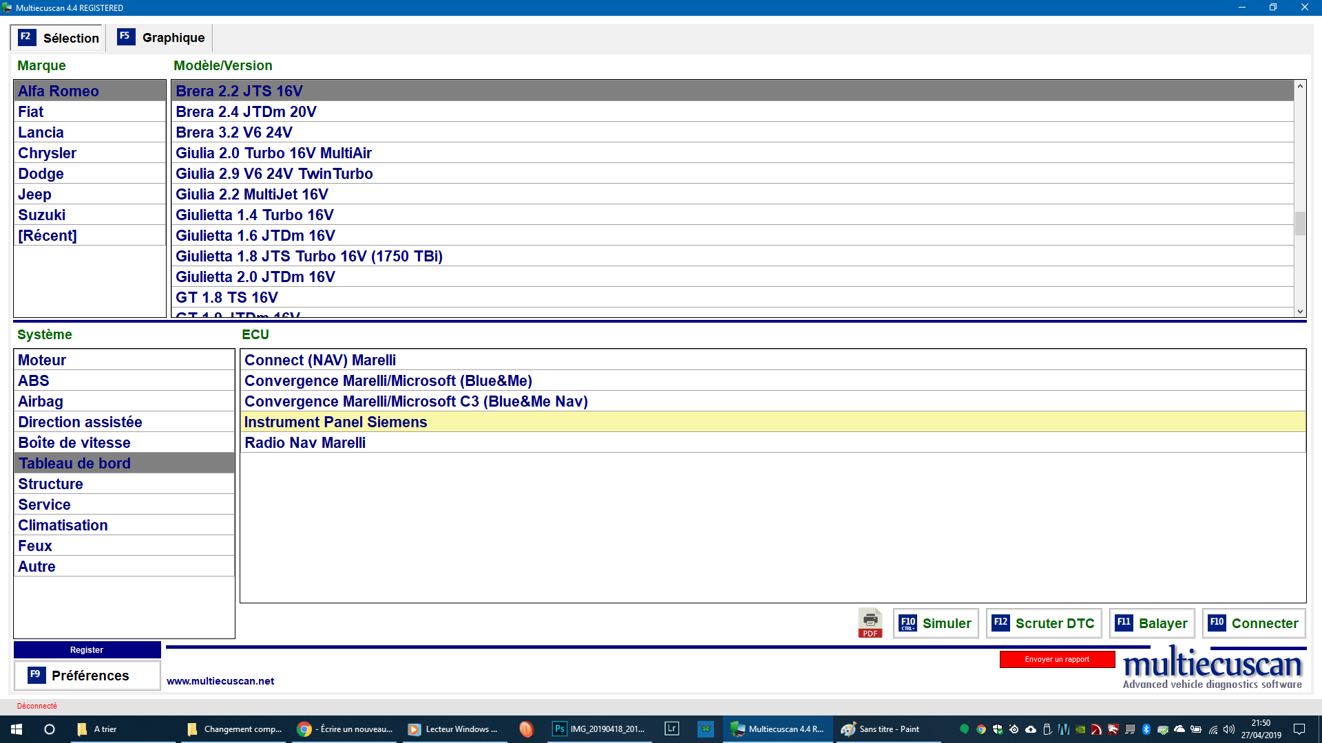 Sélectionner ensuite Alfa Romeo, votre modèle / motorisation (ici Brera 2.2 JTS), puis la structure "Tableau de bord" et "Instrument Panel Siemens". Cliquez ensuite sur "Connecter" pour y accéder.